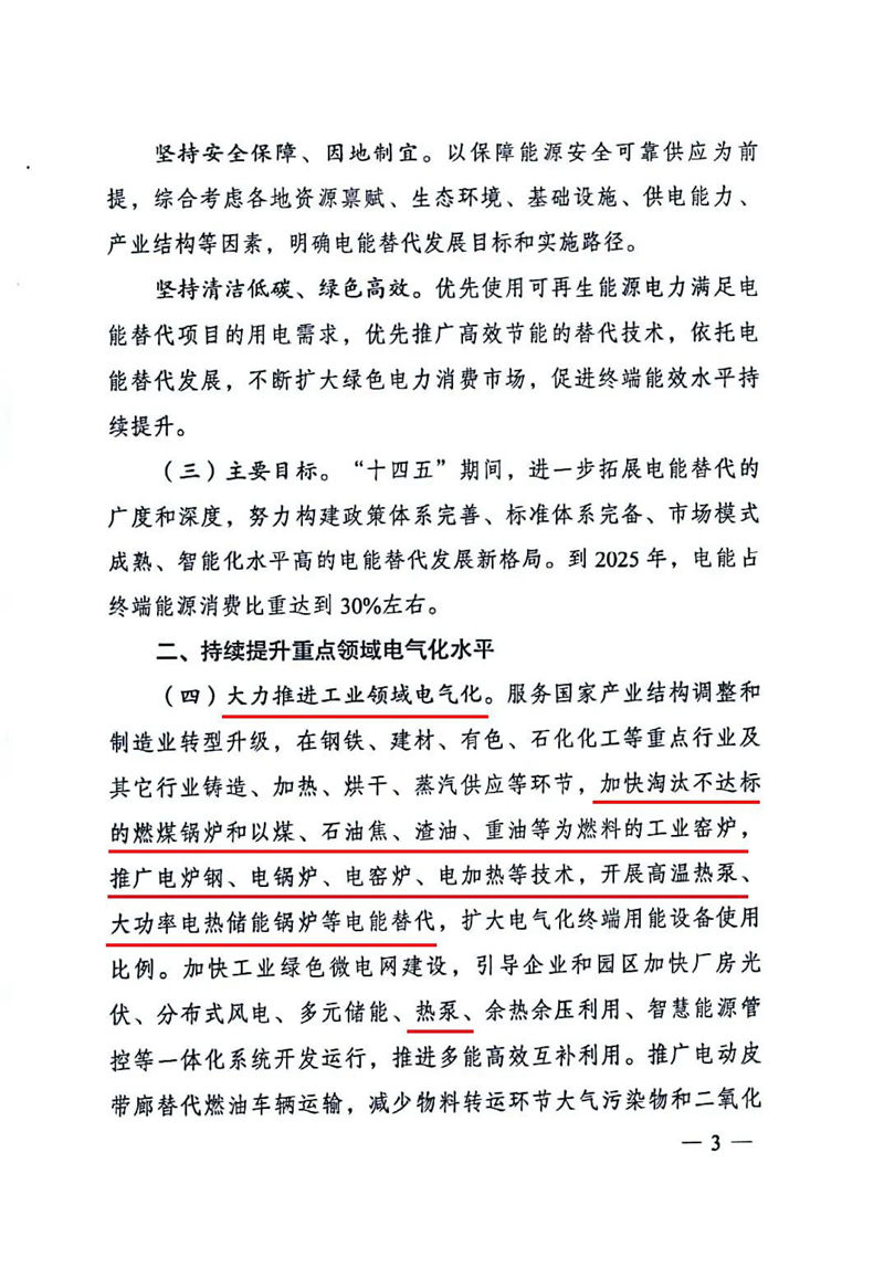 大力推进工业领域电气化。 服务国家产业结构调整和制造业转型升级,在钢铁、建材、有色、石化化工等重点行业及其它行业铸造、加热、烘干、蒸汽供应等环节,加快淘汰不达标的燃煤锅炉和以煤、石油焦、渣油、重油等为燃料的工业窑炉,推广电炉钢、电锅炉、电窑炉、电加热等技术,开展高温热泵、大功率电热储能锅炉等电能替代,扩大电气化终端用能设备使用比例。