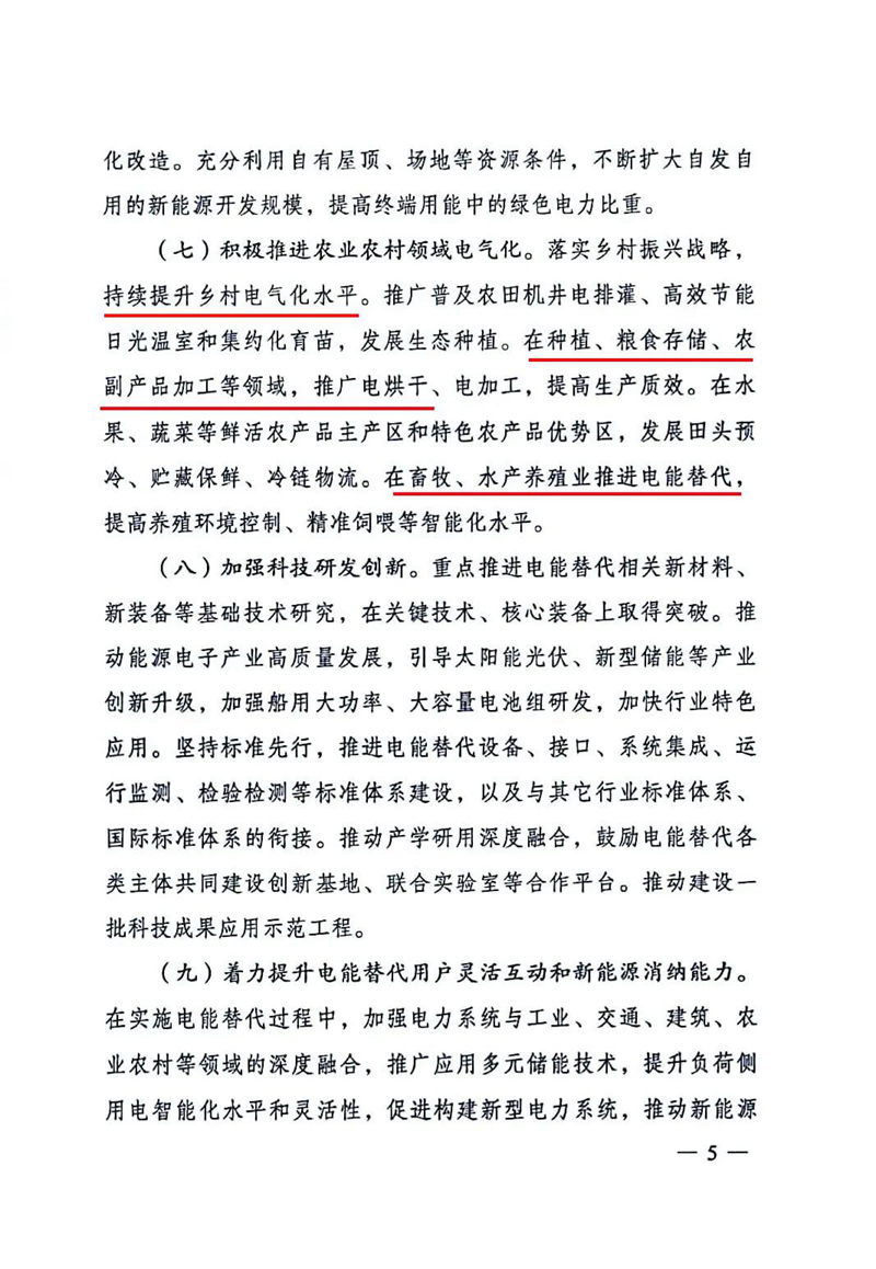 积极推进农业农村领域电气化。 在种植、粮食存储、农副产品加工等领域,推广电烘干、电加工,提高生产质效。 在水果、蔬菜等鲜活农产品主产区和特色农产品优势区,发展回头预冷、贮藏保鲜、冷链物流。 在畜牧、水产养殖业推进电能替代,提高养殖环境控制、精准饲喂等智能化水平。